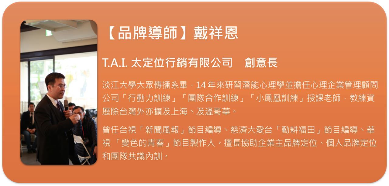 本次【台灣品牌交流協會和外貿協會高雄辦事處】共同主辦的「全方位品牌行銷經理人實務培訓班」,特別與在學/業界計有數十年經驗的四大講師聯手--策略導師 蔡明宏(麒策顧問)、創意導師 陳進東(麥傑廣告)、品牌導師 戴祥恩(太定位行銷)、行銷導師 楊清貴(未來創新學校顧問) 授課,打造30小時的精神時光屋!本次課程,將透過概念與應用兩大構面,窺透完整行銷系統!概念將從品牌建立的源頭出發,有系統地帶領學員貫穿產品開發、價格設計、通路打造、與創意推廣,盡覽行銷的全方位面向;應用的教戰,則會以豐富的業界案例及實務經驗,再藉講師導引獨特方式,讓學員體驗常輕忽的行銷戰略混淆、訂價陷阱、通路挑戰以及上市準備工作…等細節中的魔鬼。